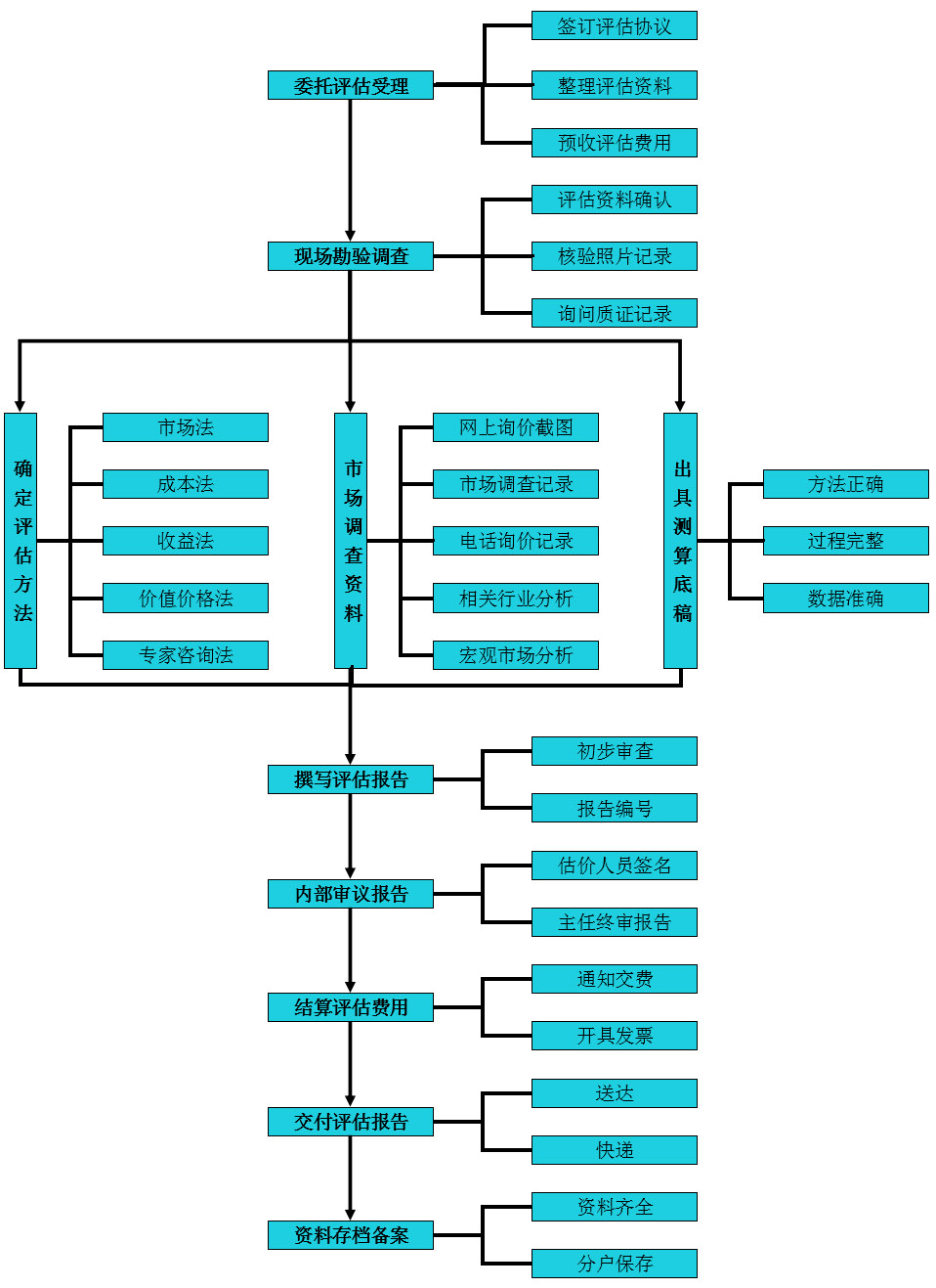 山東明信正邦評估公司評估業務流程圖如下:1、委托評估受理(簽訂評估協議、整理評估資料、預收評估費用)2、現場勘驗調查(評估資料確認、核驗照片記錄、詢問質證記錄)3.1、確認評估方法(市場法、成本法、收益法、價值價